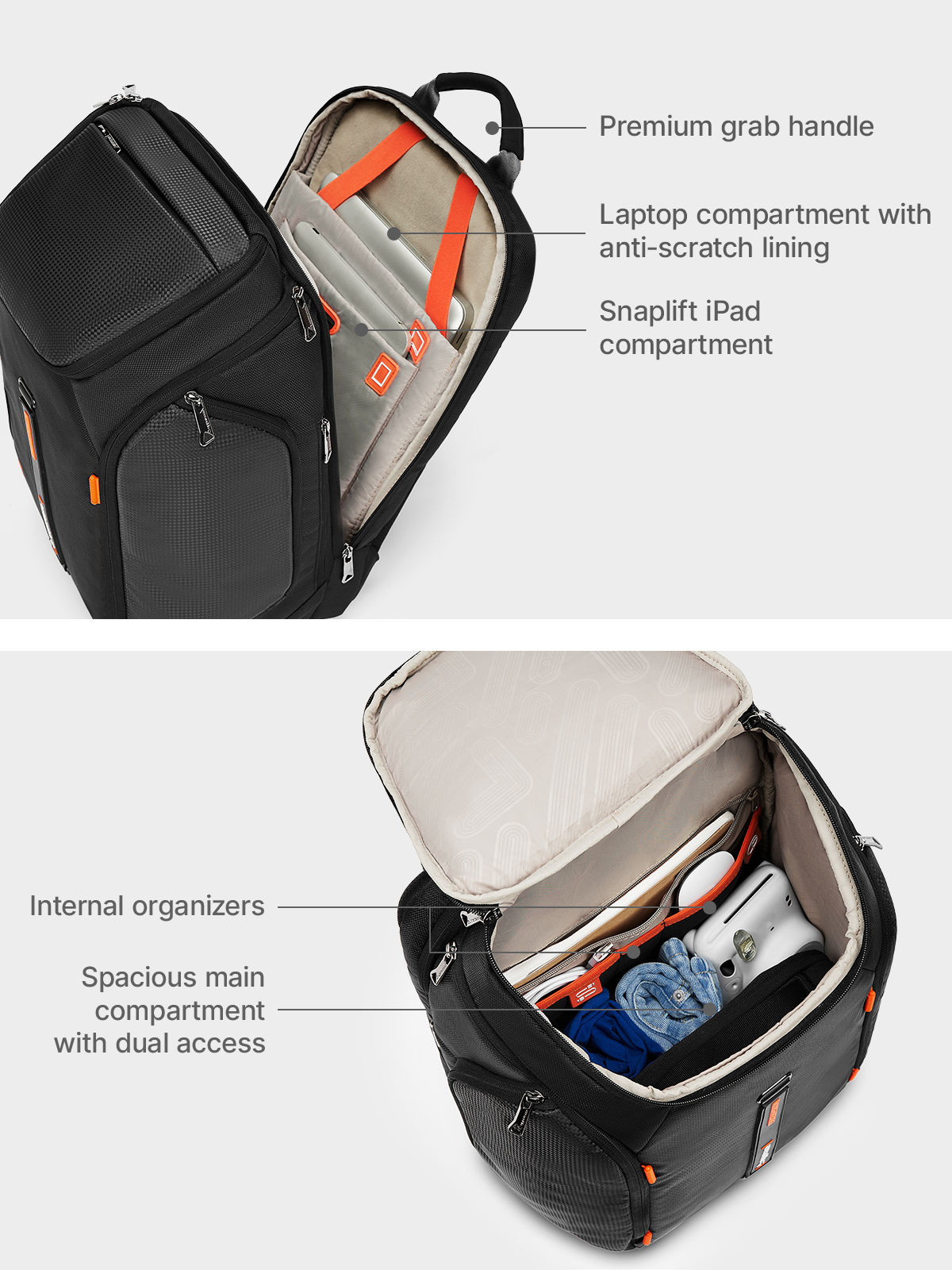 Discover the uppercase Vortex Backpack, crafted for professionals who value style and utility. Designed with a spacious main compartment, Snaplift laptop & iPad holder, and 3 external quick-access pockets, it keeps essentials organized on the go. Premium dual grab handles, tote & backpack carry options, and a trolley sleeve offer versatile comfort. Water-resistant materials, external & internal bottle pockets, plus a dedicated tech pouch make Vortex a smart choice for work, travel, or study.